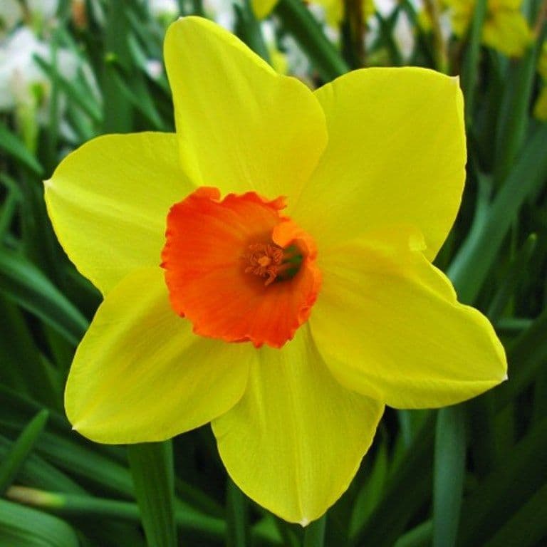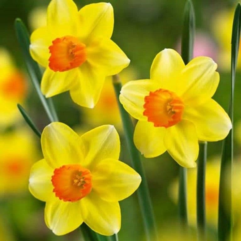 A Small-Cupped Daffodil, The Small Solitary Bloom Has Yellow Petals Surrounding An Orange-Red Cup. They Appear On Leafless Stems. Basal Leaves Are Green And Strap-Shaped.